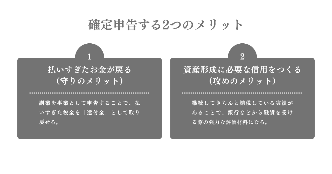 「守り」のメリットとは、副業を事業として申告することで、払いすぎた税金を「還付金」として取り戻せることです。